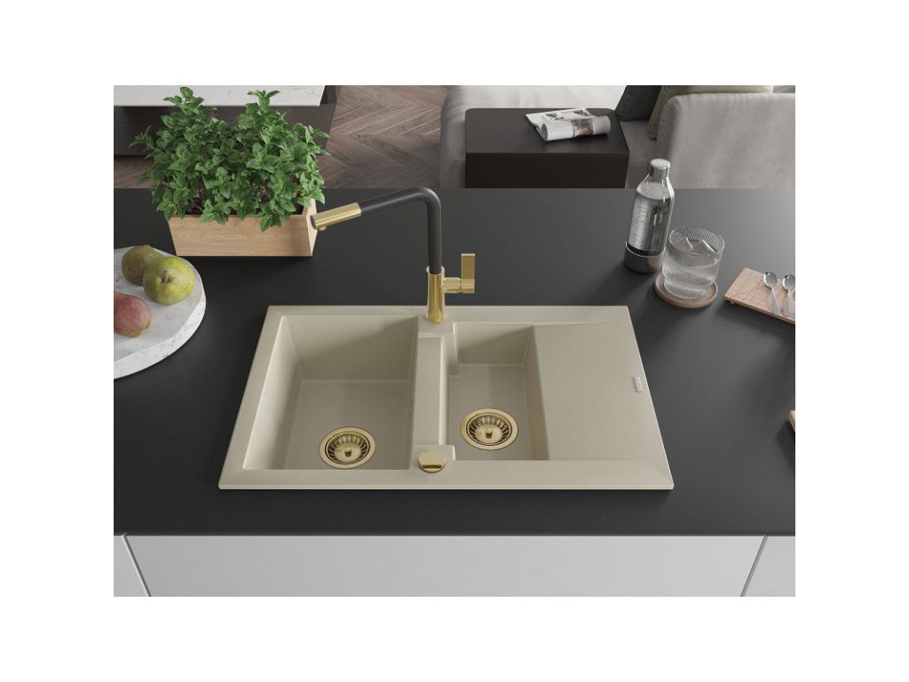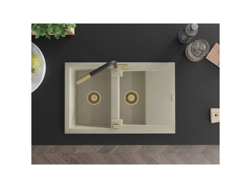Granitový drez Mexen Gaspar s 1,5 miskou, odkapávačom a kuchynskou batériou Flora, béžový - 6507-69-670401-57-G