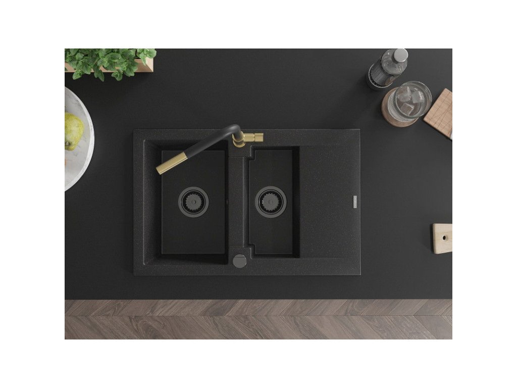 Granitový drez Mexen Gaspar s 1,5 miskou, odkapávačom a kuchynskou batériou Flora, čierny/strieborný - 6507-73-670401-57-B