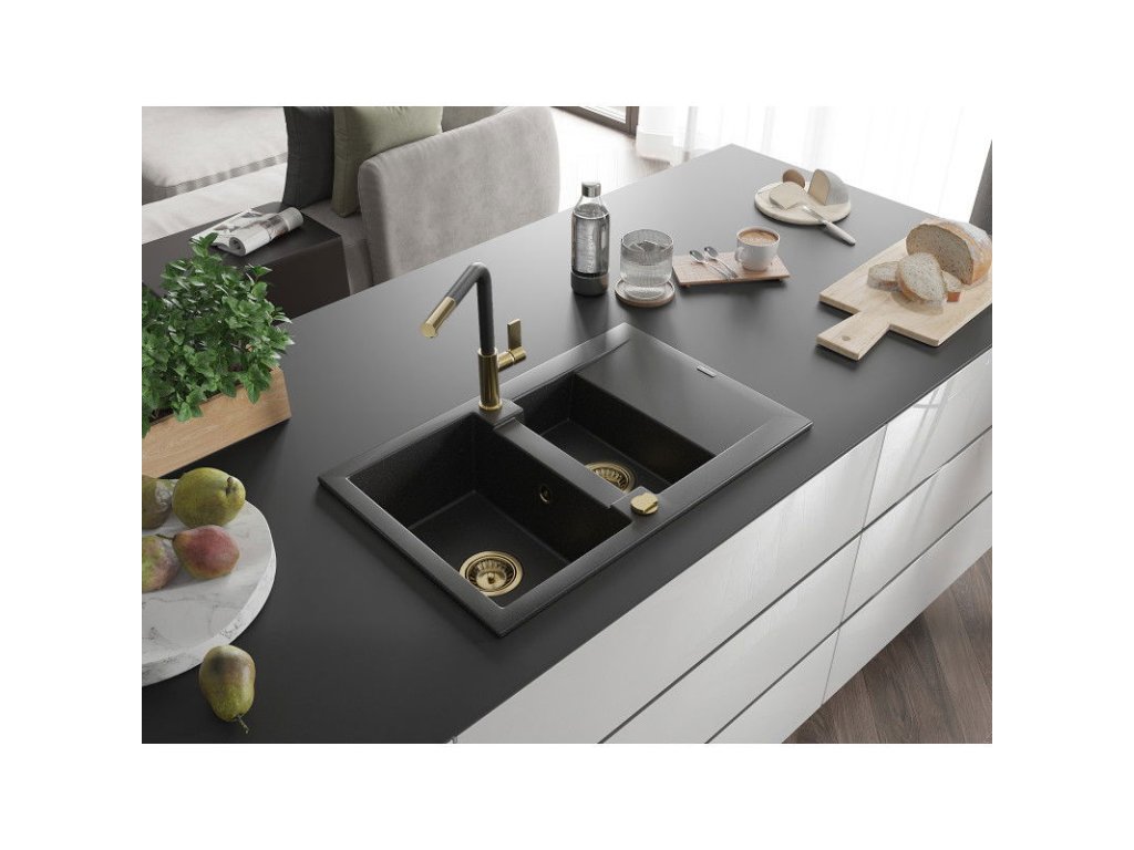 Granitový drez Mexen Gaspar s 1,5 miskou, odkapávačom a kuchynskou batériou Flora, čierny/strieborný - 6507-73-670401-57-G