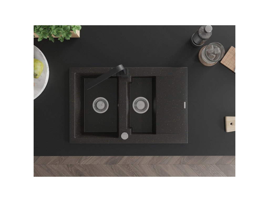 Granitový drez Mexen Gaspar s 1,5 miskou, odkapávačom a kuchynskou batériou Rita, čierna/zlatá - 6507-75-670300-70