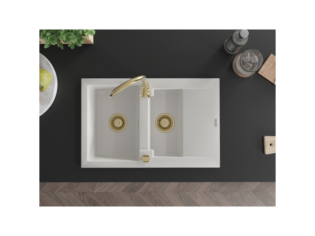 Granitový drez Mexen Gaspar s 1,5 miskou a odkapávačom 737 x 475 mm, biely, zlatý sifón - 6507731505-20-G