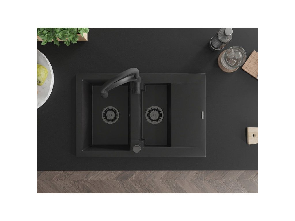 Granitový drez Mexen Gaspar s 1,5 misky, odkapávačom a kuchynskou batériou Aster, čierny - 6507-77-73450-70-B