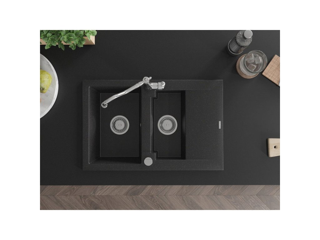 Granitový drez Mexen Gaspar s 1,5 misky, odkapávačom a kuchynskou batériou Carla čierna/strieborná metalíza - 6507-73-670700-00