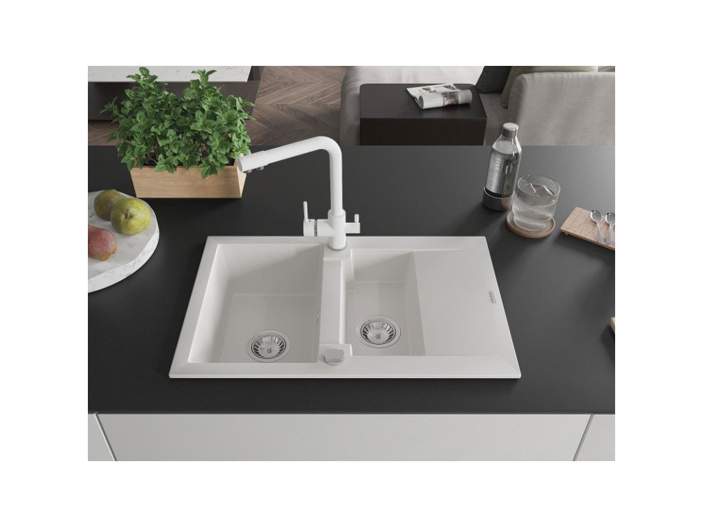 Granitový drez Mexen Gaspar s 1,5 misky, odkapávačom a kuchynskou batériou Duero, biely - 6507-20-671600-20