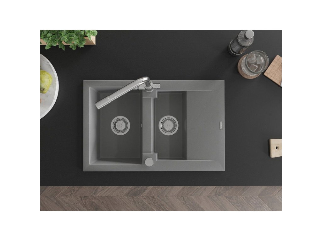 Granitový drez Mexen Gaspar s 1,5 misky, odkapávačom a kuchynskou batériou Duero, sivý - 6507-71-671600-00