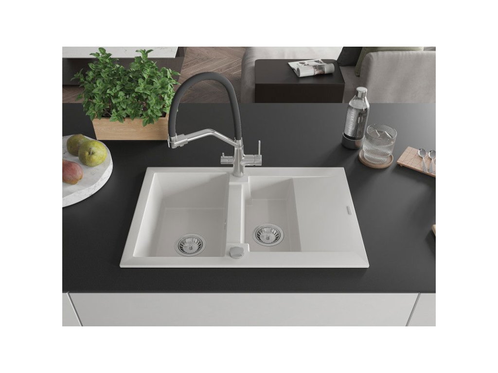 Granitový drez Mexen Gaspar s 1,5 misky, odkapávačom a kuchynskou batériou Duo, biely - 6507-20-671701-07