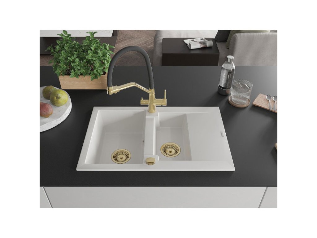Granitový drez Mexen Gaspar s 1,5 misky, odkapávačom a kuchynskou batériou Duo, biely - 6507-20-671701-57-G