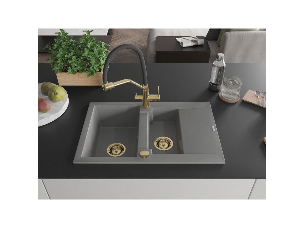 Granitový drez Mexen Gaspar s 1,5 misky, odkapávačom a kuchynskou batériou Duo, sivý - 6507-71-671701-57-G