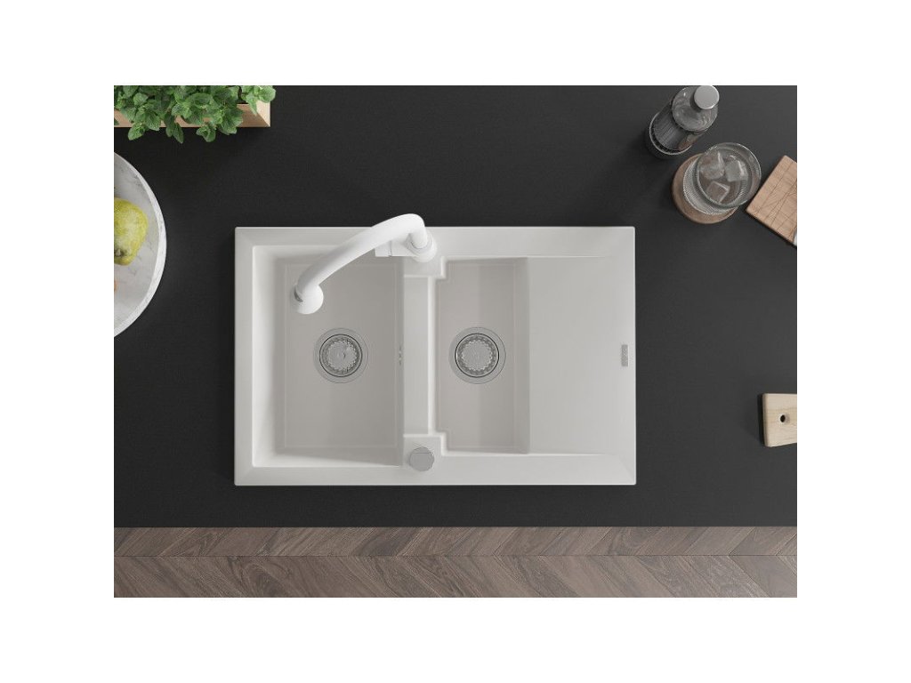 Granitový drez Mexen Gaspar s 1,5 misky, odkapávačom a kuchynskou batériou Elia, biely - 6507-20-670101-20