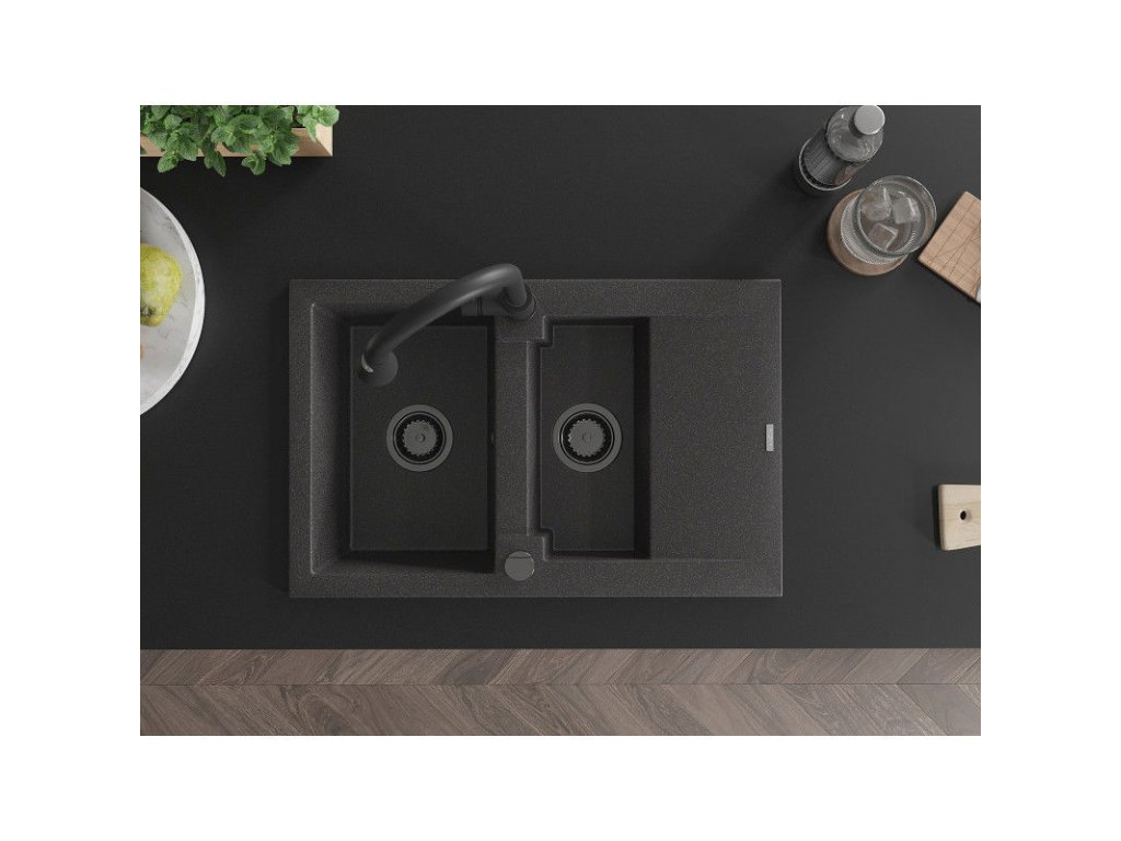 Granitový drez Mexen Gaspar s 1,5 misky, odkapávačom a kuchynskou batériou Elia, čierna škvrnitá - 6507-76-670101-70-B