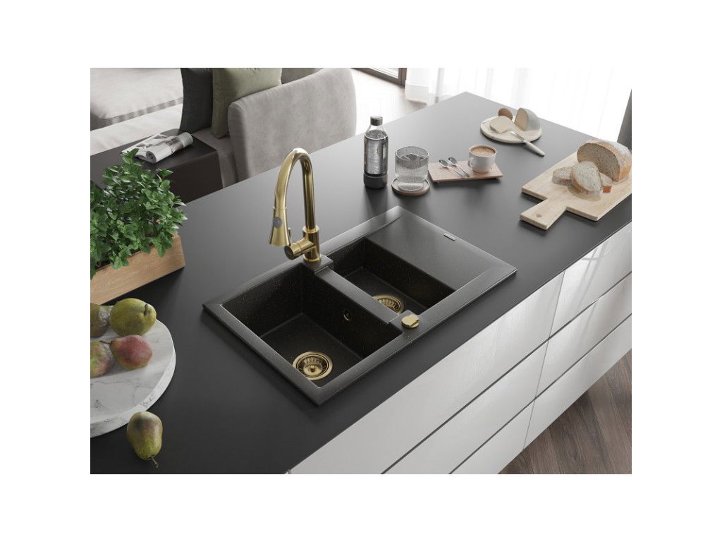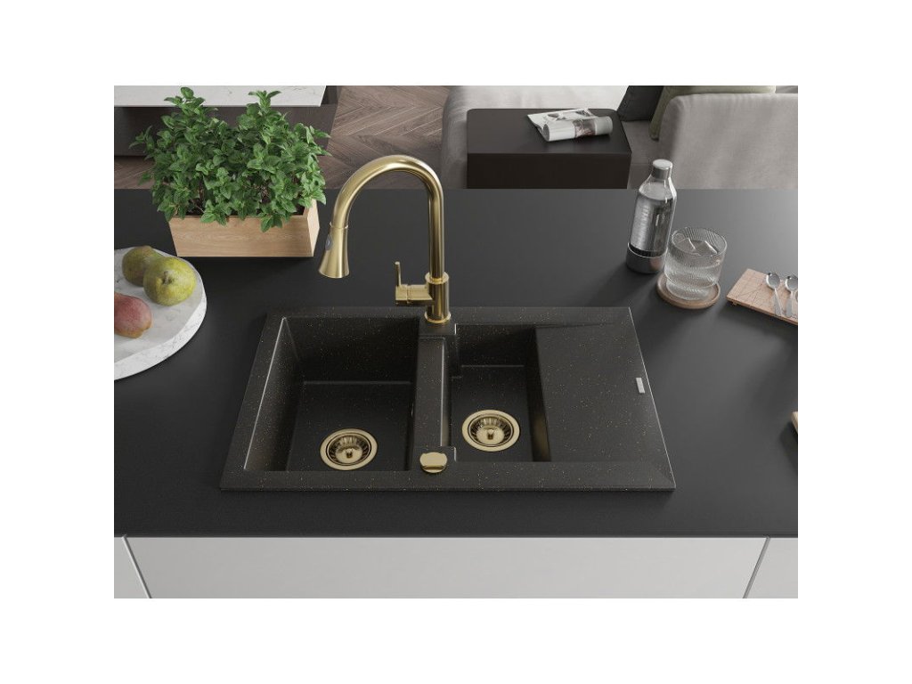 Granitový drez Mexen Gaspar s 1,5 misky, odkapávačom a kuchynskou batériou Elia, čierna/zlatá metalíza - 6507-75-670101-50