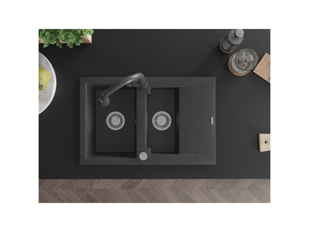 Granitový drez Mexen Gaspar s 1,5 misky, odkapávačom a kuchynskou batériou Elia, čierny bodkovaný - 6507-76-670101-76