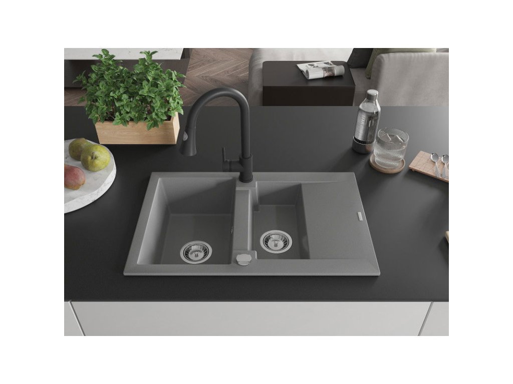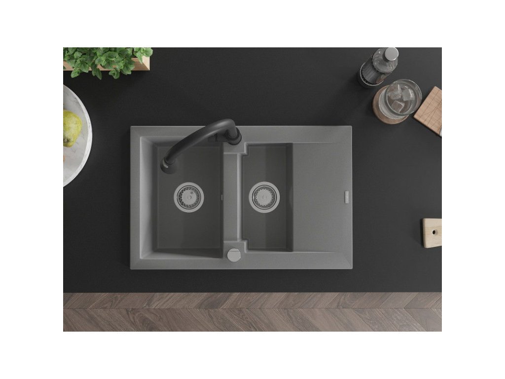 Granitový drez Mexen Gaspar s 1,5 misky, odkapávačom a kuchynskou batériou Elia, sivý - 6507-71-670101-70