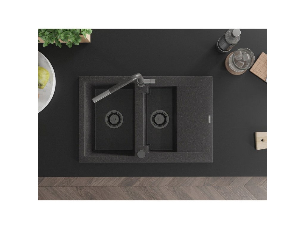 Granitový drez Mexen Gaspar s 1,5 misky, odkapávačom a kuchynskou batériou Flora, čierna škvrnitá - 6507-76-670401-08-B