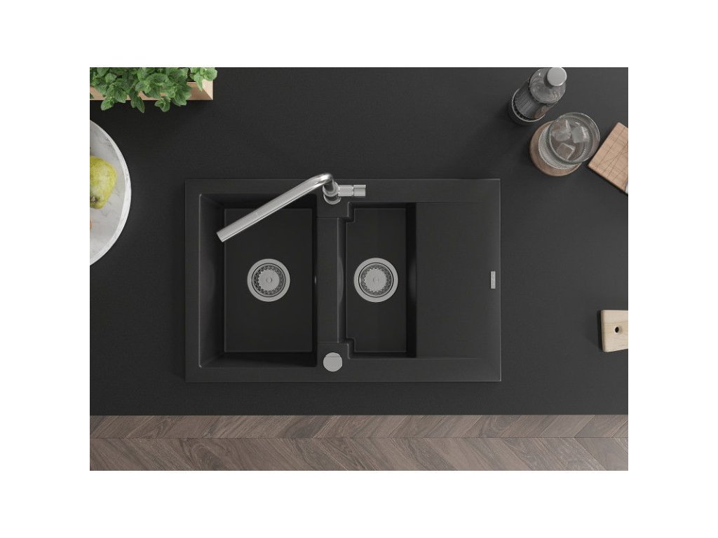 Granitový drez Mexen Gaspar s 1,5 misky, odkapávačom a kuchynskou batériou Flora, čierny - 6507-77-670401-00