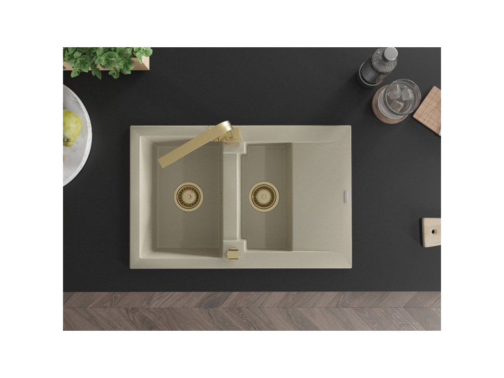 Granitový drez Mexen Gaspar s 1,5 misky, odkapávačom a kuchynskou batériou Rita, béžový - 6507-69-670300-50