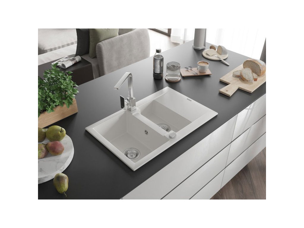 Granitový drez Mexen Gaspar s 1,5 misky, odkapávačom a kuchynskou batériou Rita, biely - 6507-20-670300-00