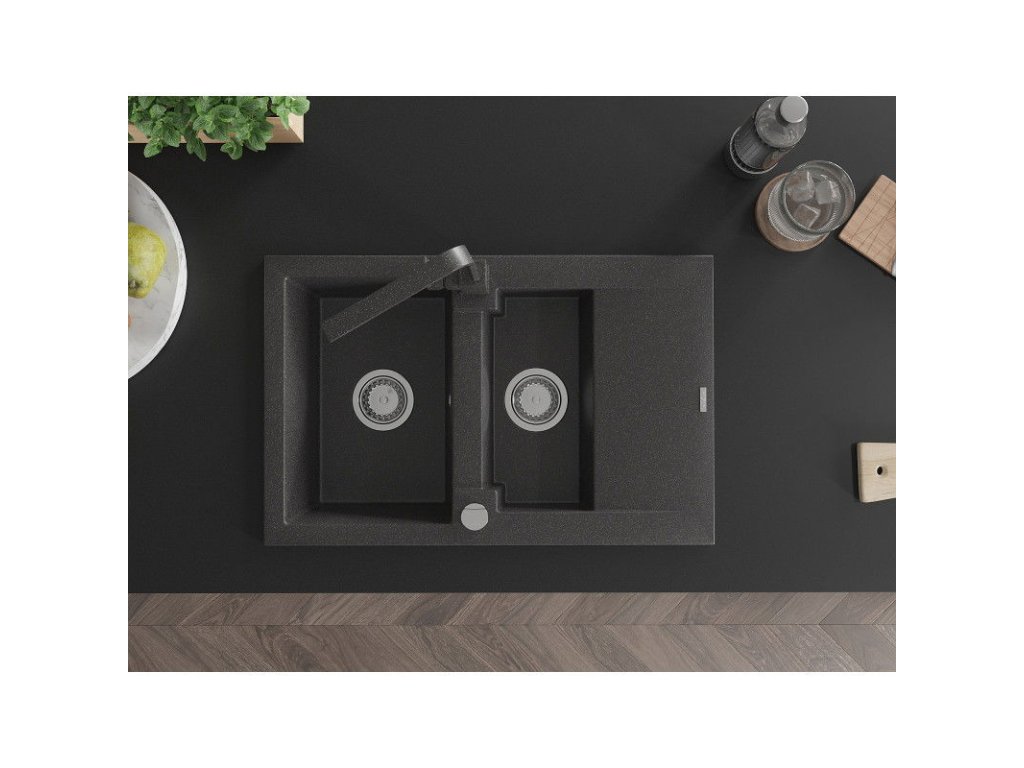 Granitový drez Mexen Gaspar s 1,5 misky, odkapávačom a kuchynskou batériou Rita, čierna škvrnitá - 6507-76-670300-76