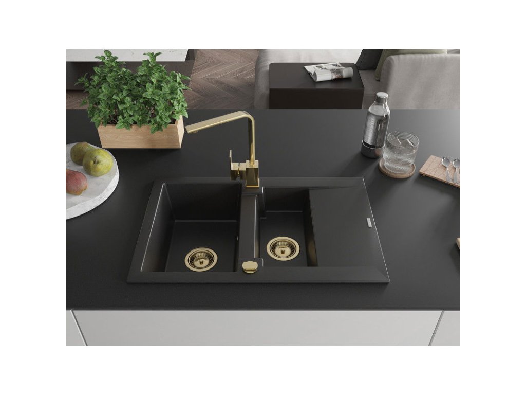 Granitový drez Mexen Gaspar s 1,5 misky, odkapávačom a kuchynskou batériou Rita, čierny - 6507-77-670300-50