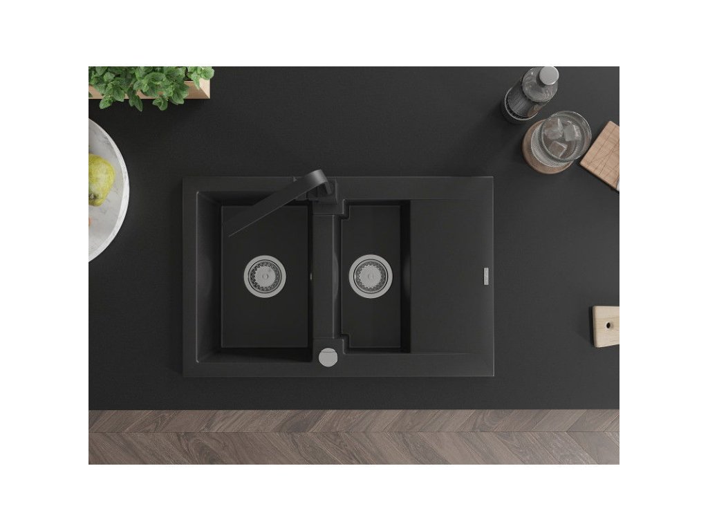 Granitový drez Mexen Gaspar s 1,5 misky, odkapávačom a kuchynskou batériou Rita, čierny - 6507-77-670300-70