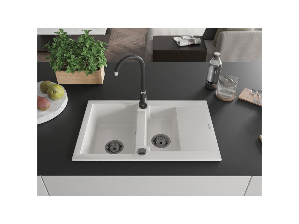 Granitový drez Mexen Gaspar s 1,5 misky, odkapávačom a kuchynskou batériou Telma, biely - 6507-20-670200-70