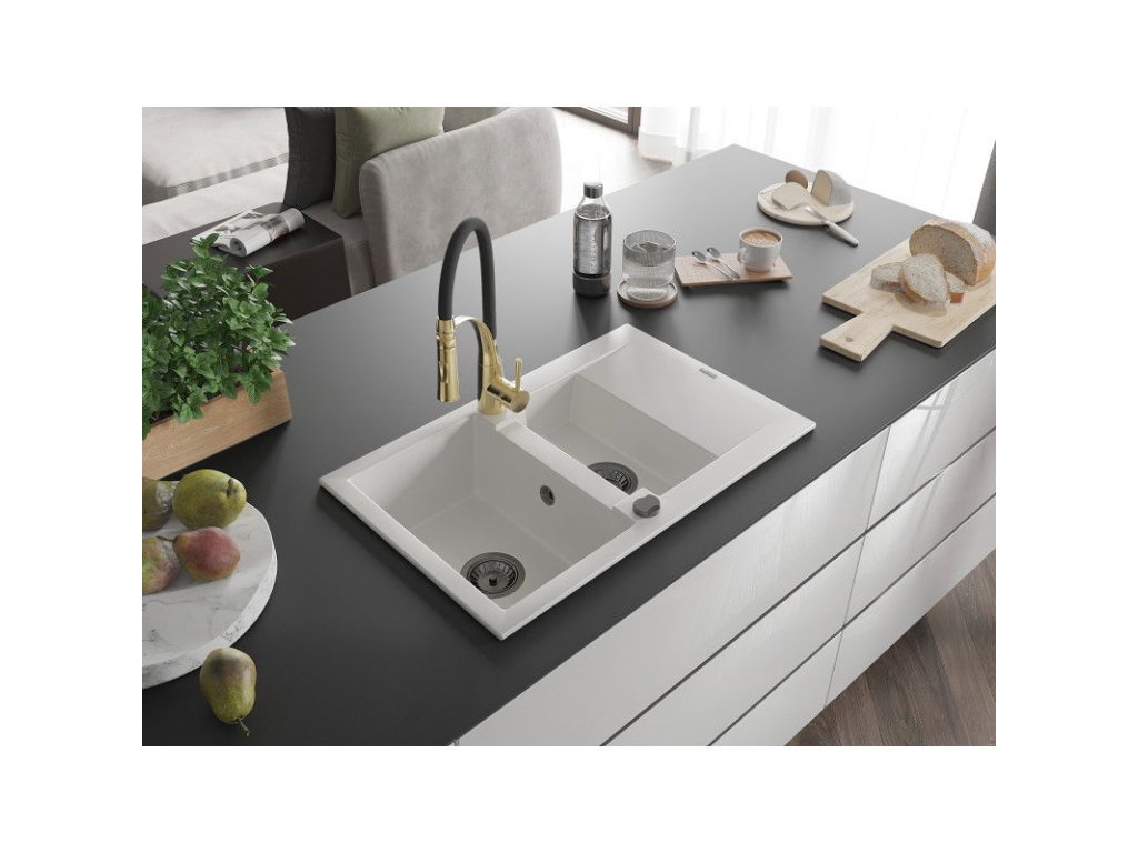 Granitový drez Mexen Gaspar s 1,5 misy, odkapávačom a kuchynskou batériou Aster, biely - 6507-20-73450-57-B