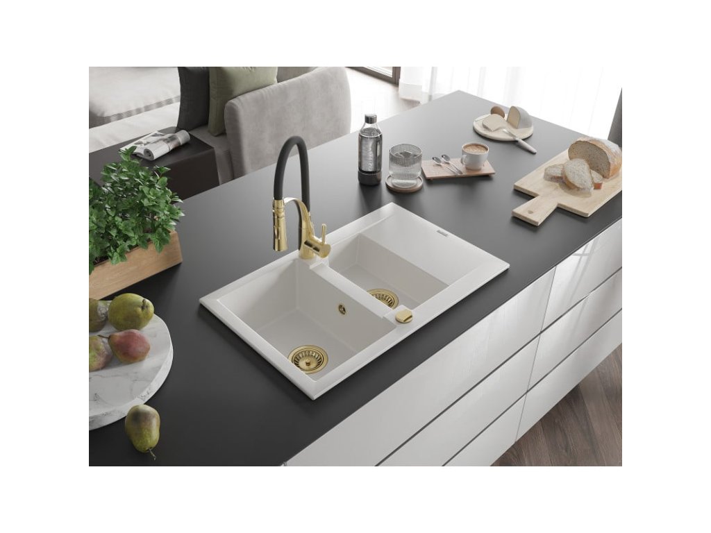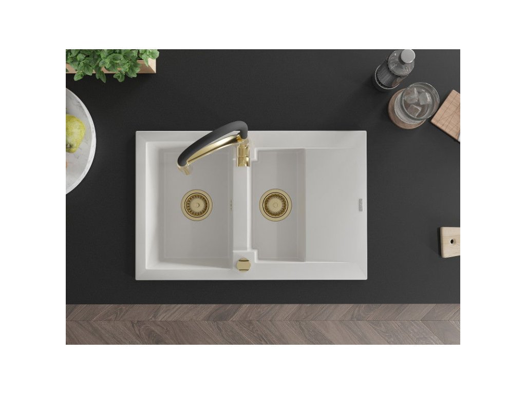 Granitový drez Mexen Gaspar s 1,5 misy, odkapávačom a kuchynskou batériou Aster, biely - 6507-20-73450-57-G