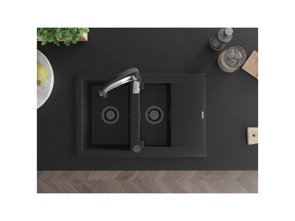 Granitový drez Mexen Gaspar s 1,5 misy, odkapávačom a kuchynskou batériou Aster, čierny - 6507-77-73450-07-B