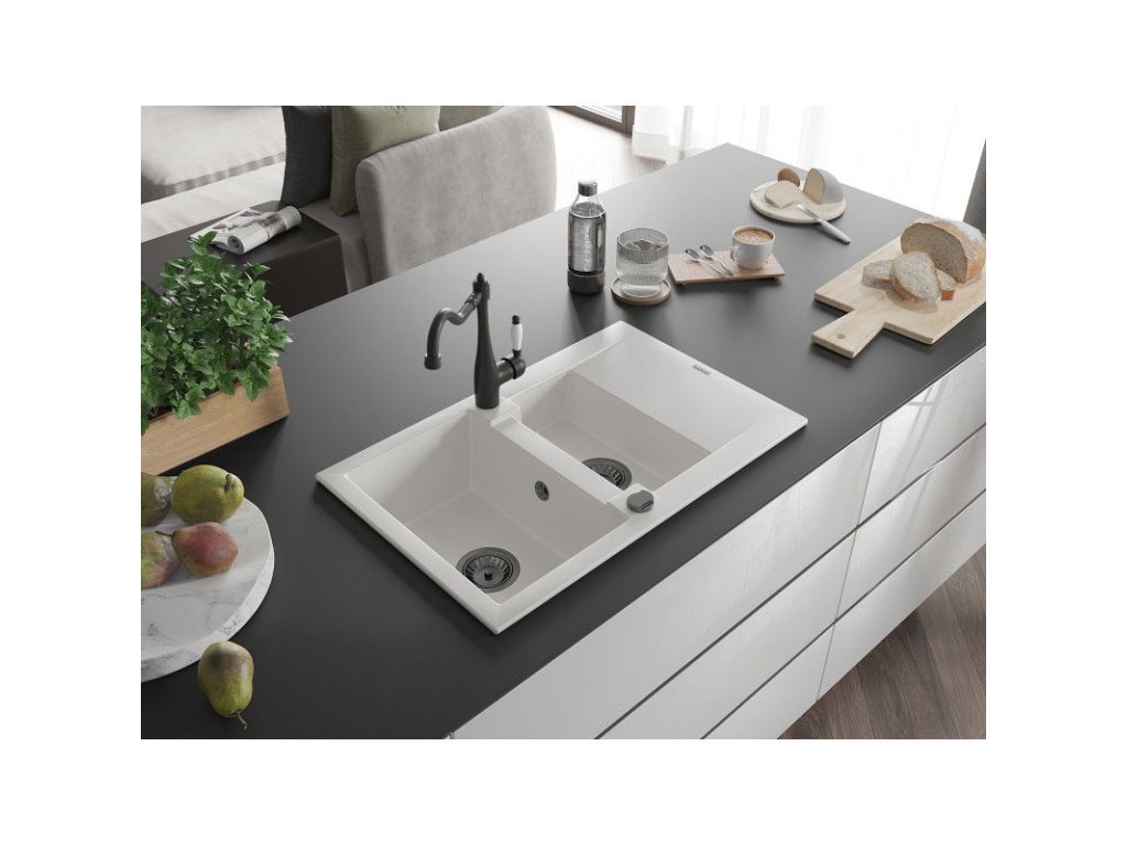 Granitový drez Mexen Gaspar s 1,5 misy, odkapávačom a kuchynskou batériou Carla, biely - 6507-20-670700-70