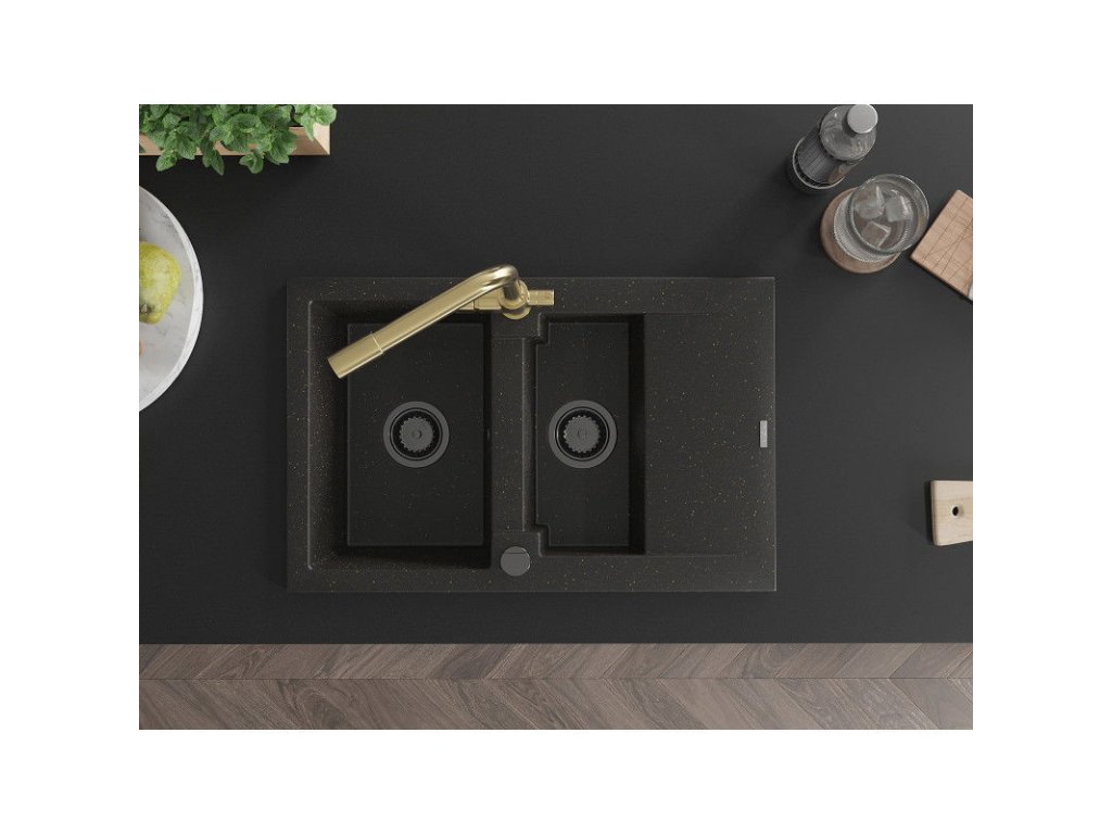 Granitový drez Mexen Gaspar s 1,5 misy, odkapávačom a kuchynskou batériou Duero, čierna/zlatá - 6507-75-671600-50-B