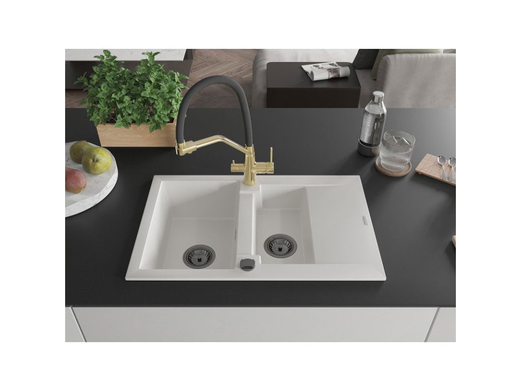 Granitový drez Mexen Gaspar s 1,5 misy, odkapávačom a kuchynskou batériou Duo, biely - 6507-20-671701-57-B