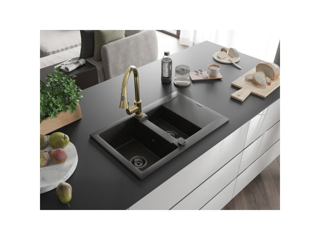 Granitový drez Mexen Gaspar s 1,5 misy, odkapávačom a kuchynskou batériou Elia, čierna/zlatá metalíza - 6507-75-670101-50-B