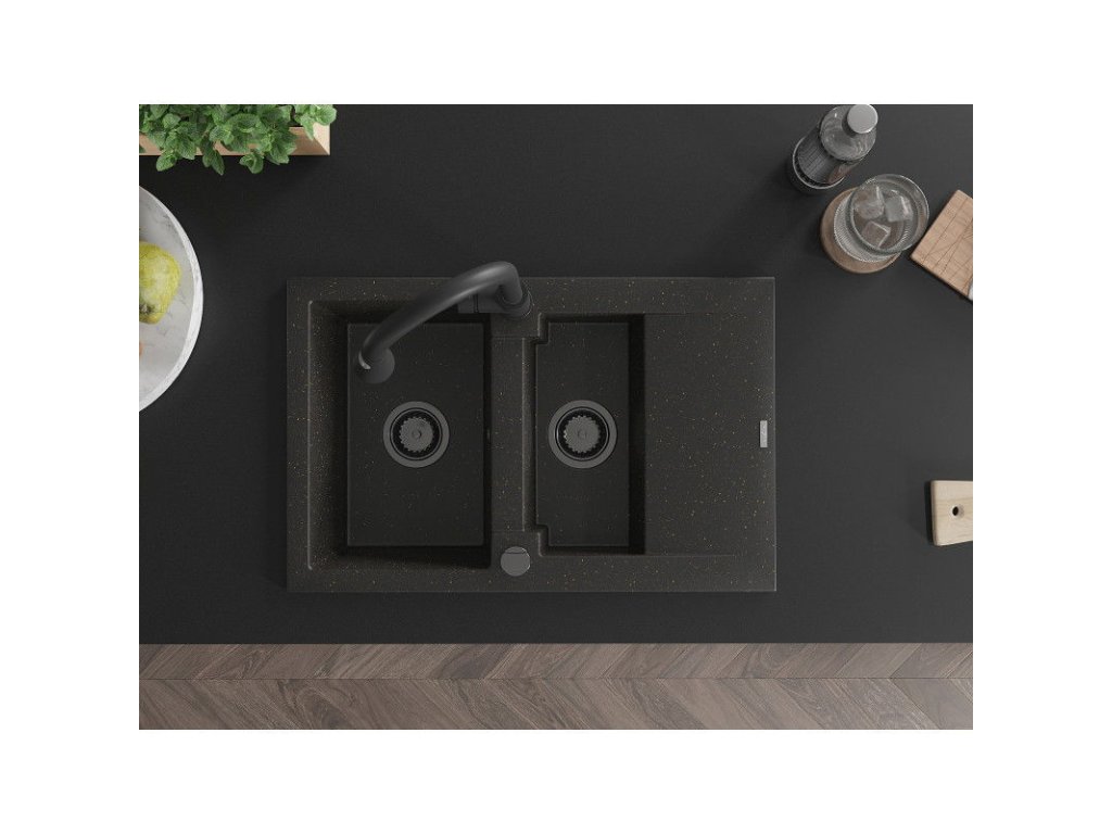 Granitový drez Mexen Gaspar s 1,5 misy, odkapávačom a kuchynskou batériou Elia, čierna/zlatá metalíza - 6507-75-670101-70-B