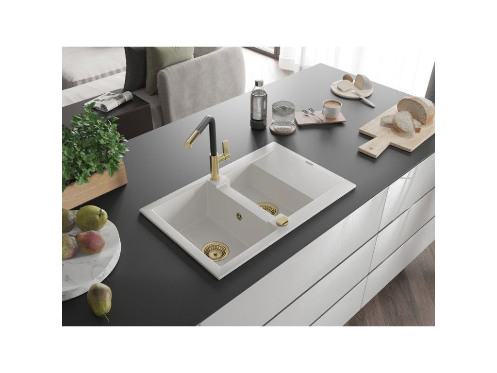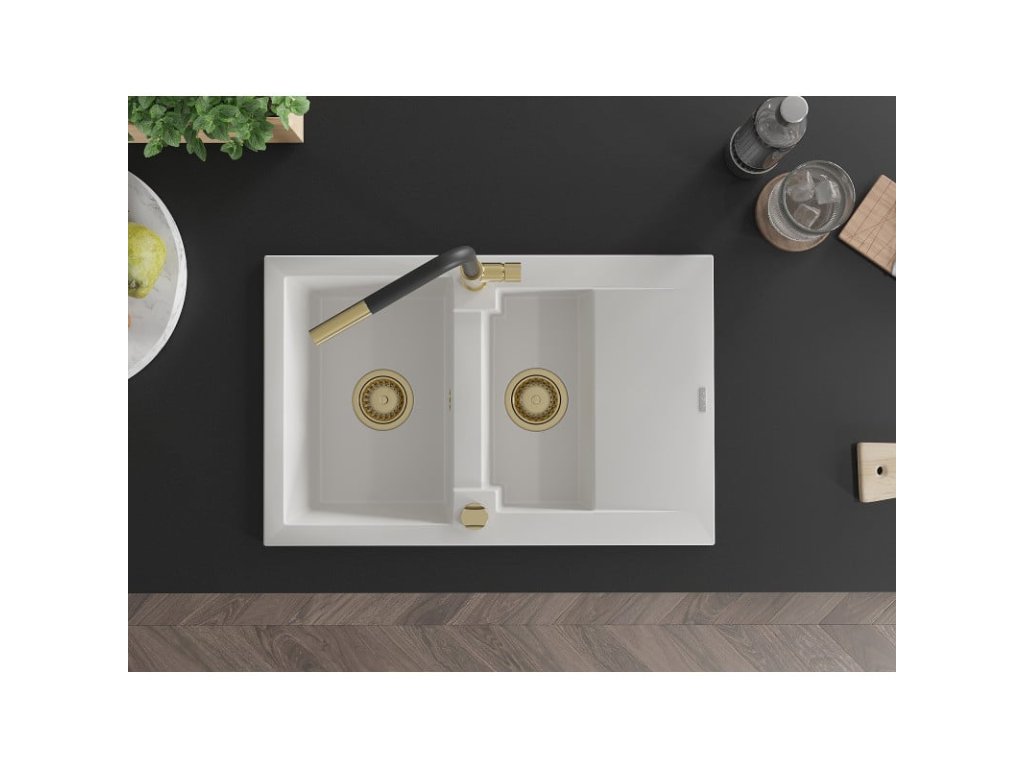 Granitový drez Mexen Gaspar s 1,5 misy, odkapávačom a kuchynskou batériou Flora, biely - 6507-20-670401-57-G
