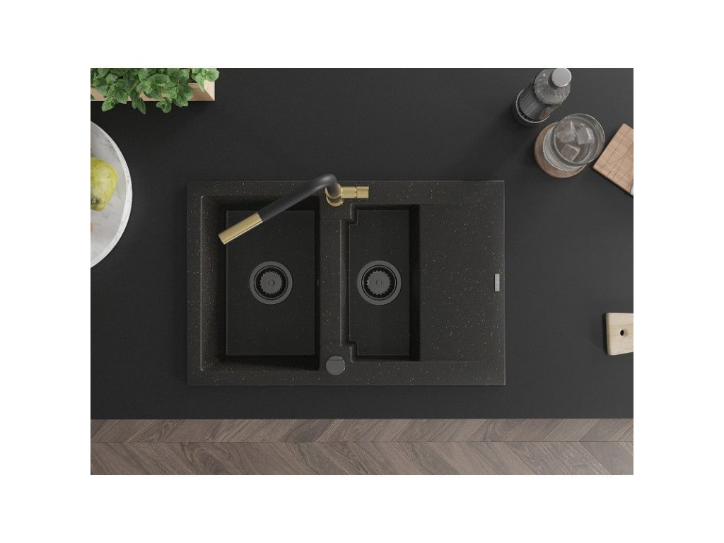 Granitový drez Mexen Gaspar s 1,5 misy, odkapávačom a kuchynskou batériou Flora, čierna/zlatá - 6507-75-670401-57-B
