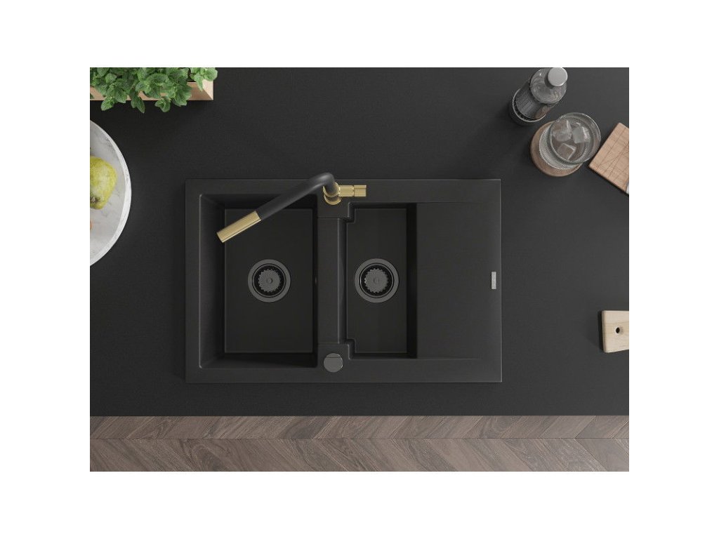 Granitový drez Mexen Gaspar s 1,5 misy, odkapávačom a kuchynskou batériou Flora, čierny - 6507-77-670401-57-B