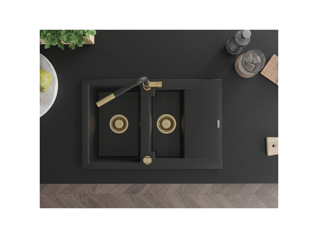Granitový drez Mexen Gaspar s 1,5 misy, odkapávačom a kuchynskou batériou Flora, čierny - 6507-77-670401-57-G