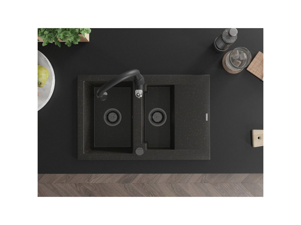 Granitový drez Mexen Gaspar s 1,5 misy, odkapávačom a kuchynskou batériou Savita, čierna/zlatá - 6507-75-672601-70-B