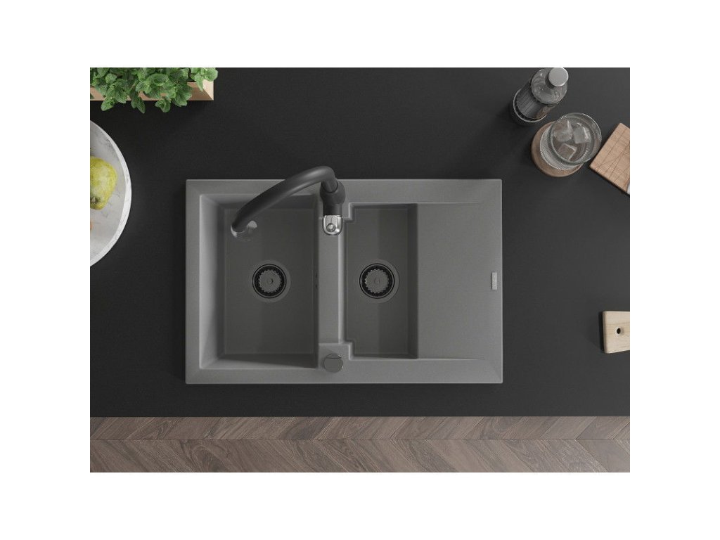 Granitový drez Mexen Gaspar s 1,5 misy, odkapávačom a kuchynskou batériou Savita, sivý - 6507-71-672601-70-B