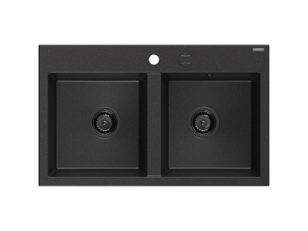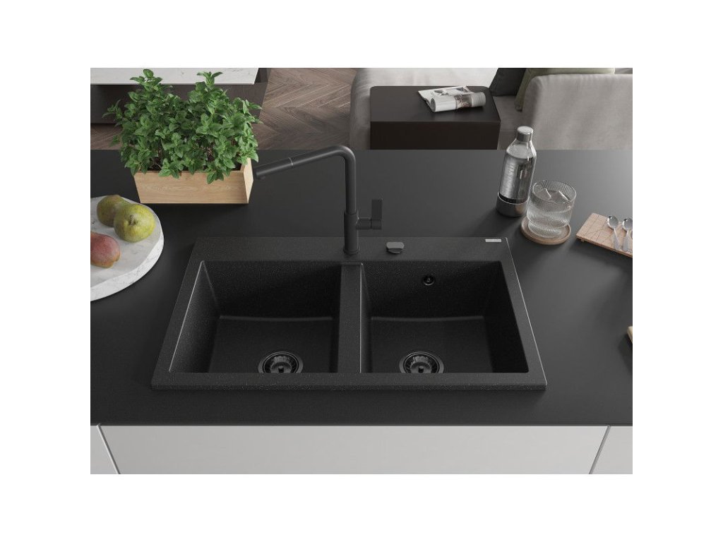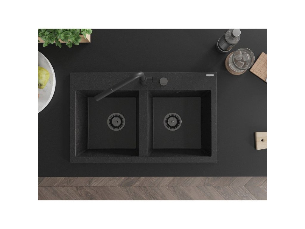 Granitový drez Mexen Hektor s 2 misami 800 x 480 mm, čierna/strieborná metalíza, čierny sifón - 6521802000-73-B