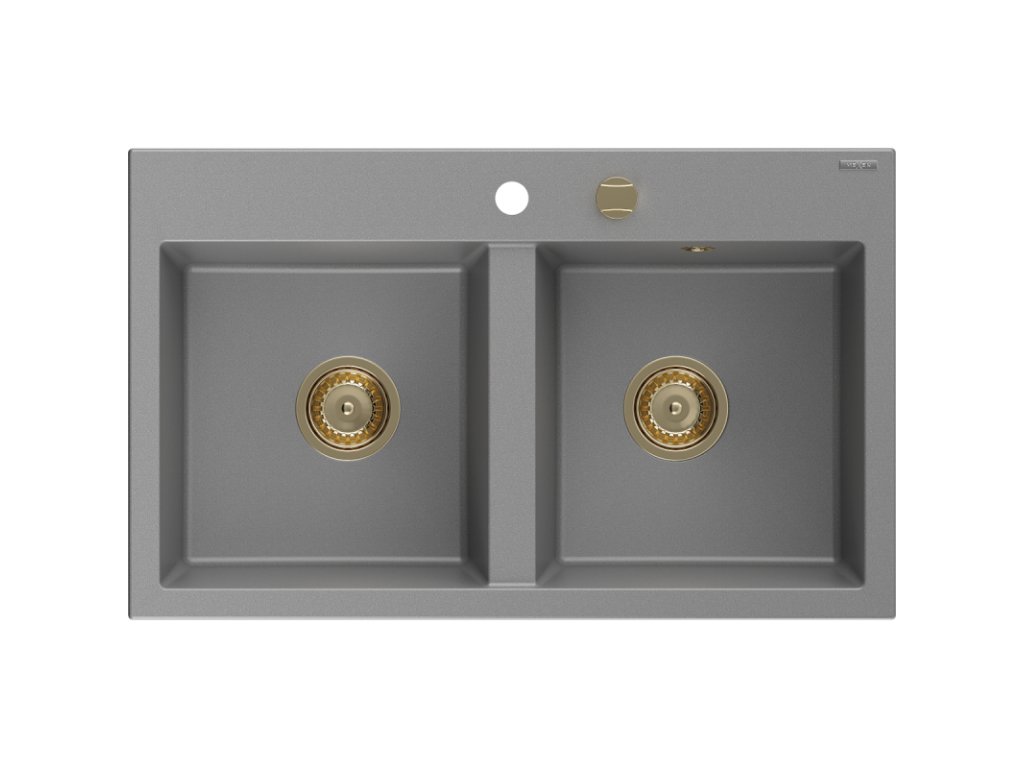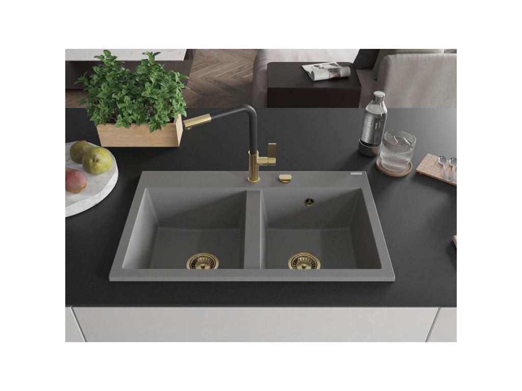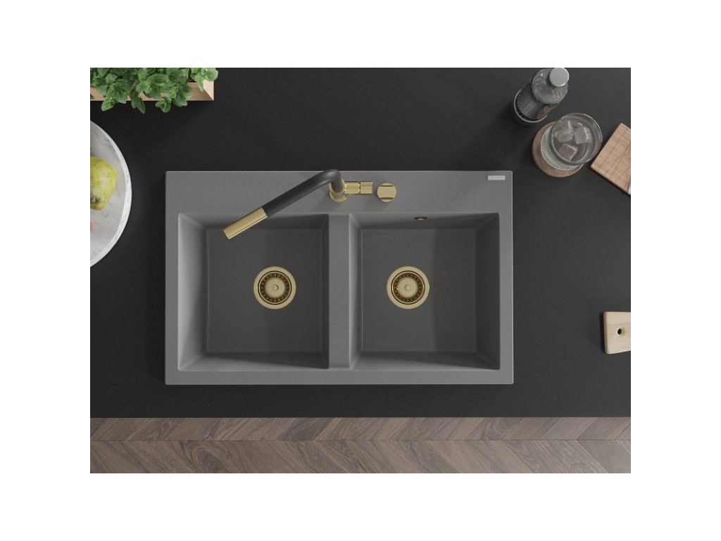 Granitový drez Mexen Hektor s 2 misami 800 x 480 mm, sivý, zlatý sifón - 6521802000-71-G