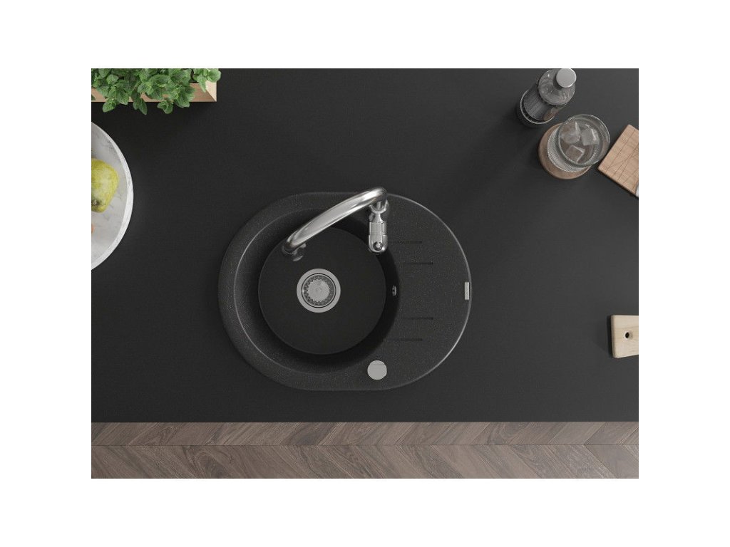 Granitový drez Mexen Kevin s 1 misou, odkapávačom a batériou Savita, čierna/strieborná metalíza - 6517-73-672601-00