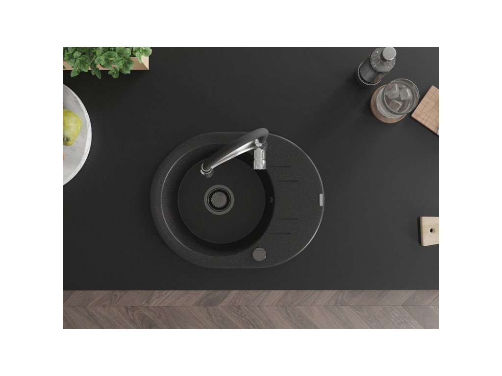 Granitový drez Mexen Kevin s 1 misou, odkapávačom a kuchynskou batériou Aster, čierna/strieborná metalíza - 6517-73-73450-07-B