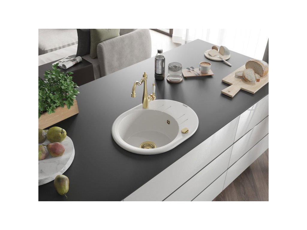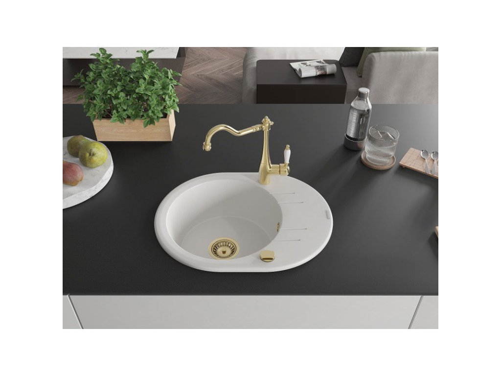 Granitový drez Mexen Kevin s 1 misou, odkapávačom a kuchynskou batériou Carla, biely - 6517-20-670700-50