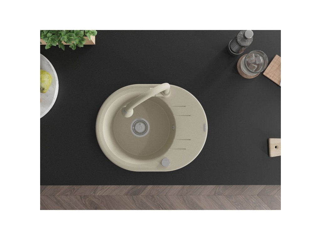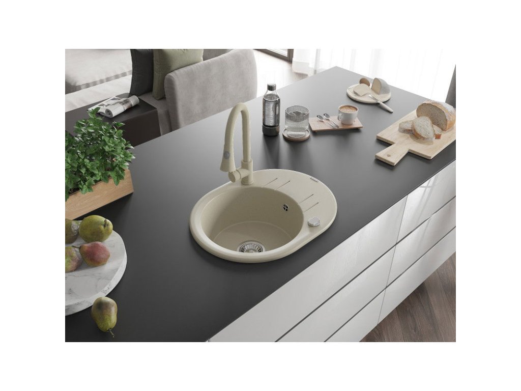 Granitový drez Mexen Kevin s 1 misou, odkapávačom a kuchynskou batériou Elia, béžový - 6517-69-670101-69