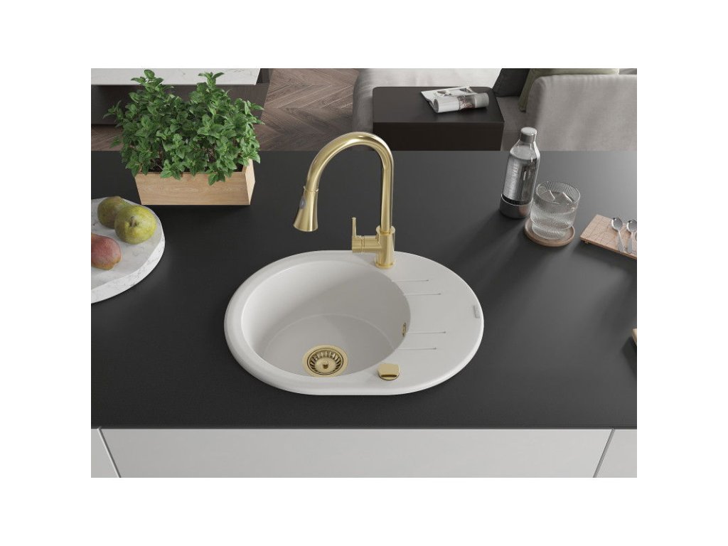 Granitový drez Mexen Kevin s 1 misou, odkapávačom a kuchynskou batériou Elia, biely - 6517-20-670101-50