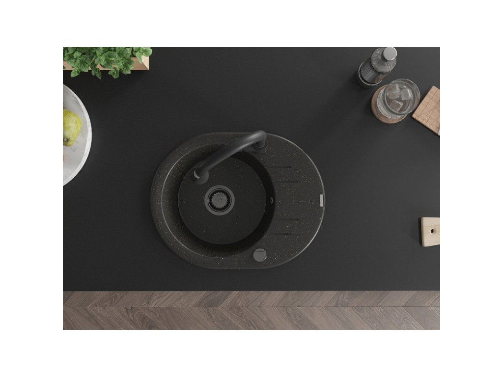 Granitový drez Mexen Kevin s 1 misou, odkapávačom a kuchynskou batériou Elia, čierna/zlatá metalíza - 6517-75-670101-70-B