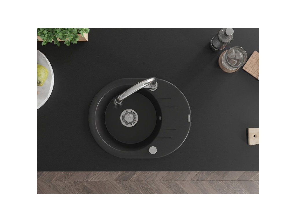 Granitový drez Mexen Kevin s 1 misou, odkapávačom a kuchynskou batériou Elia, čierny - 6517-77-670101-00