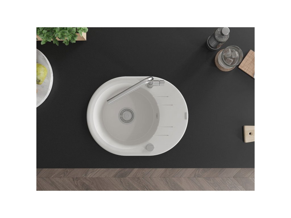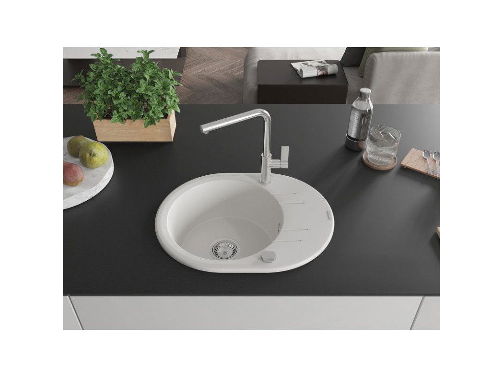 Granitový drez Mexen Kevin s 1 misou, odkapávačom a kuchynskou batériou Flora, biely - 6517-20-670401-00