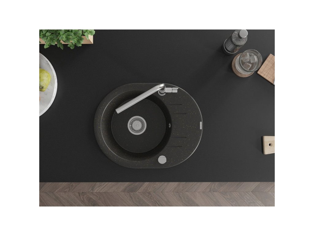 Granitový drez Mexen Kevin s 1 misou, odkapávačom a kuchynskou batériou Flora, čierna/zlatá metalíza - 6517-75-670401-00